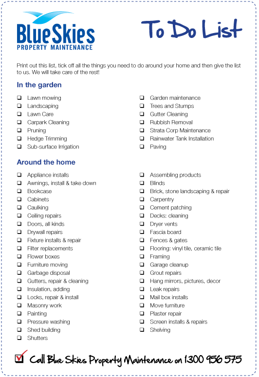 Click on the image below to download our to do list as a pdf. Simply go through the list, check off everything you need done around the house and then give us a call!!